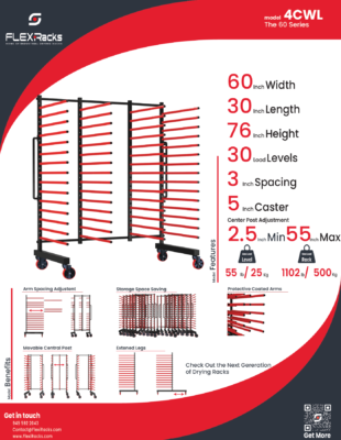 The FlexiRacks Model 4CWL is a 60‑inch‑wide, single‑sided drying rack engineered for high‑capacity, professional use. With 30 loading levels, adjustable spacing, and heavy‑duty steel construction, it delivers the flexibility, durability, and efficiency required in demanding production environments.